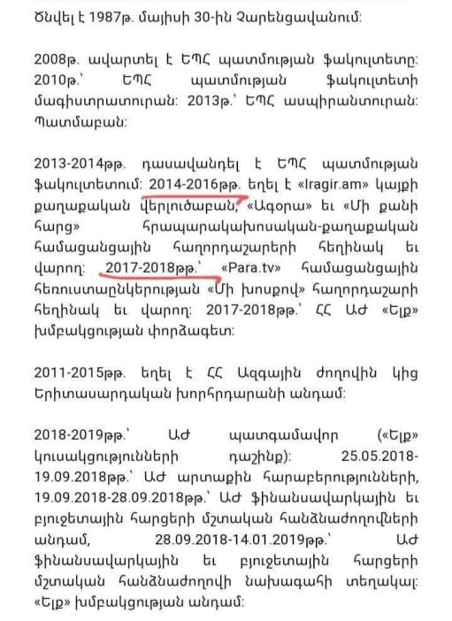 2017-2018 թվականներին եղել է «Para.tv» համացանցային հեռուստաընկերության «Մի խոսքով» հաղորդաշարի հեղինակ և վարող։ (էլի ներկայացնում ենք պաշտոնական փաստաթուղթը):