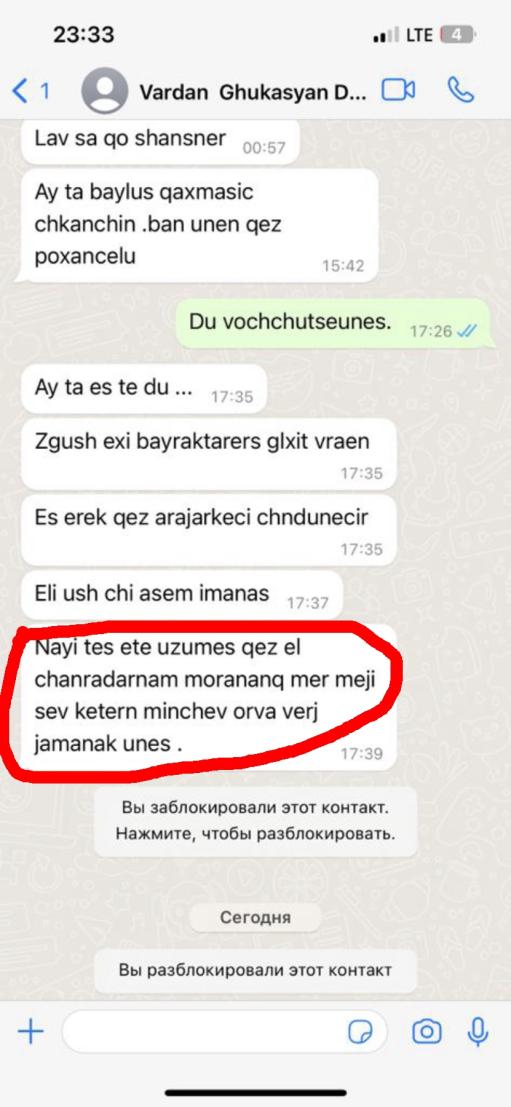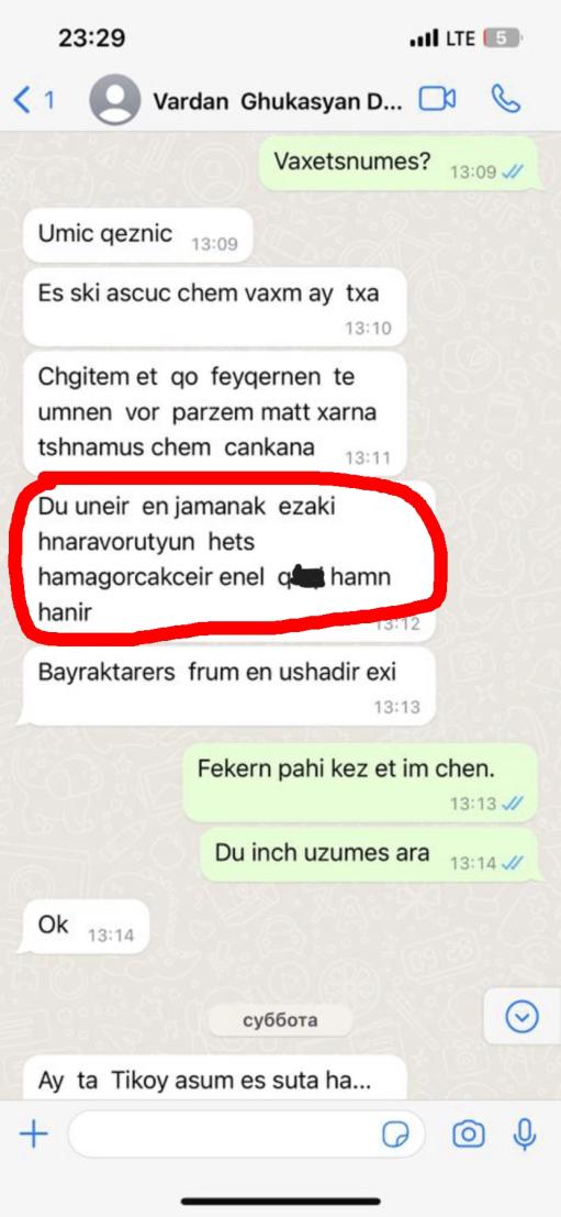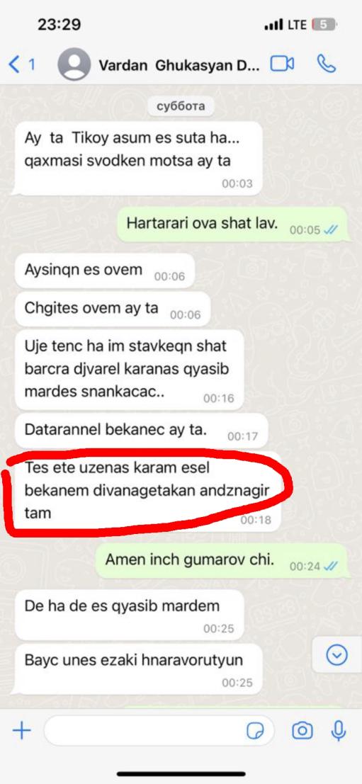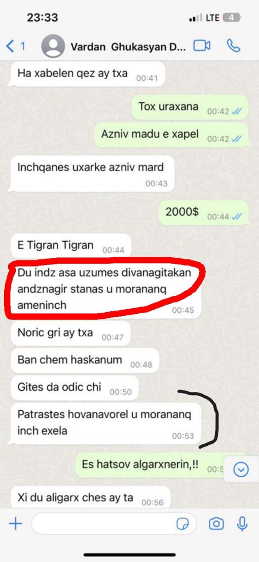 Ստորև ներկայացվում է քրեական վարույթի շրջանակներում ձեռք բերված՝ բջջային հավելվածի միջոցով գիշերային ակումբի ներկայացուցչի, ինչպես նաև Տ․Ա․-ի հետ (վերջիններիս համաձայնութամբ) Վարդան Ղուկասյանի ունեցած խոսակցության՝ վերաբերելի և կարևոր հատվածների էկրանապատկերները։