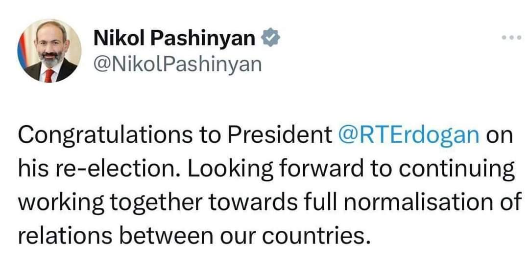 Նիկոլ Փաշինյանը, հազիվ Թուրքիայի ընտրություններն ավարտված, շտապել է շնորհավորել է Ռեջեփ Թայիփ Էրդողանին` վերընտրվելու կապակցությամբ: