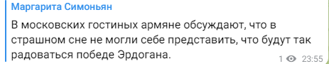 «Մոսկովյան հյուրասենյակներում հայերը քննարկում են, որ ամենավատ երազում անգամ չէին պատկերացնի, որ այդքան կուրախանան Էրդողանի հաղթանակով»,- գրել է նա: