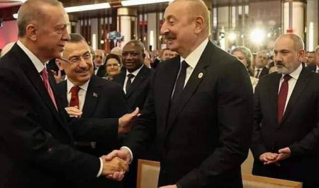 2,5 տարի առաջ այս երկուսը պայմանավորված ու բնական է՝ լավ պլանավորած հարձակվեցին փոքրիկ Արցախ պետության վրա: Էն հետևի կանգնածը, էս կողմից, իբր երաշխավոր լինելով, ամեն բան թարս արեց, ամենայն հավանականությամբ՝ որ այս երկուսի «գործը» հաջողի: Հիմա, այս երկուսը, որ իրար ձեռք են սեղմում, երրորդը հետևները կանգնած...ուշադրություն էլի...ծափ է տալիս: