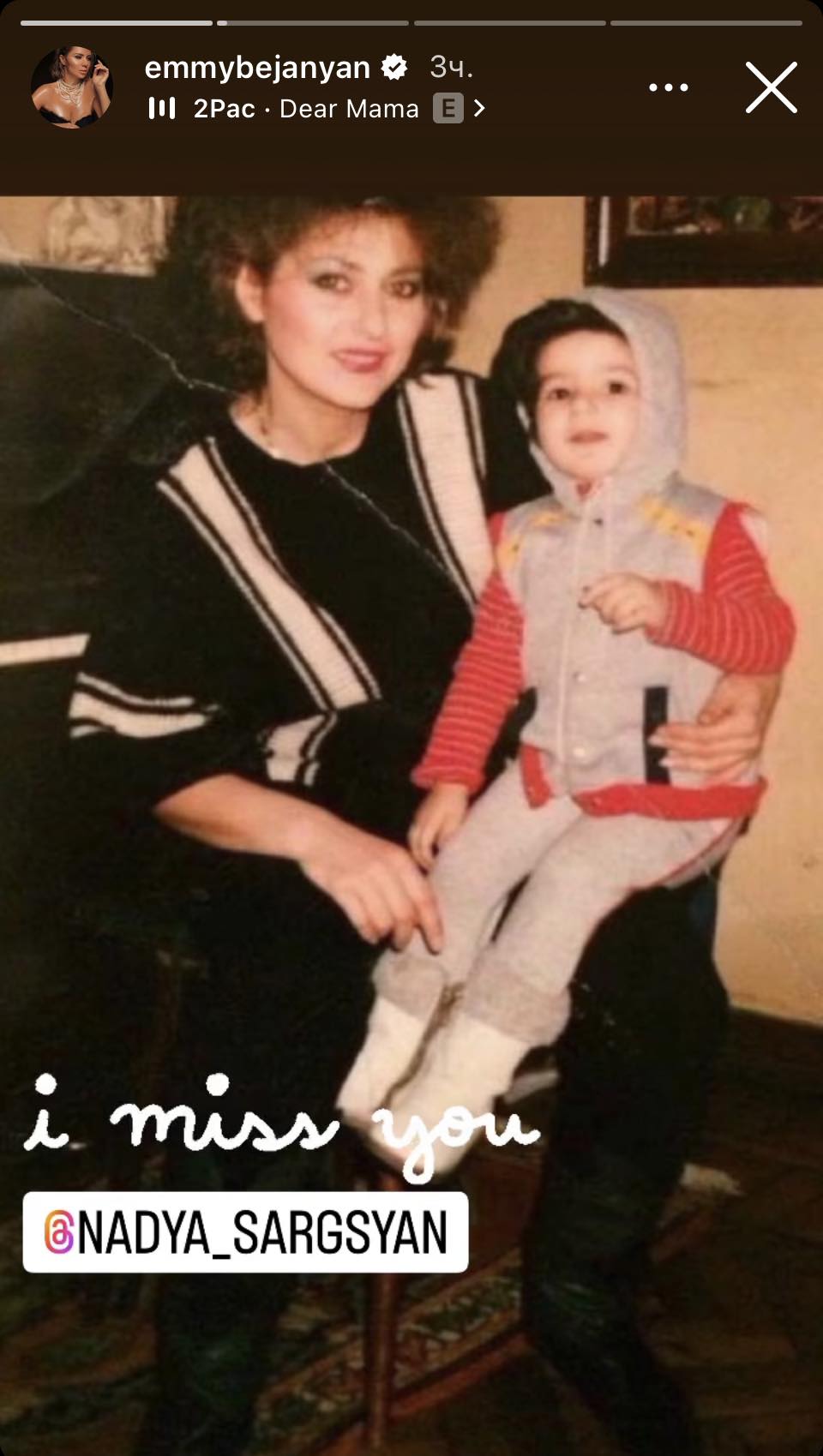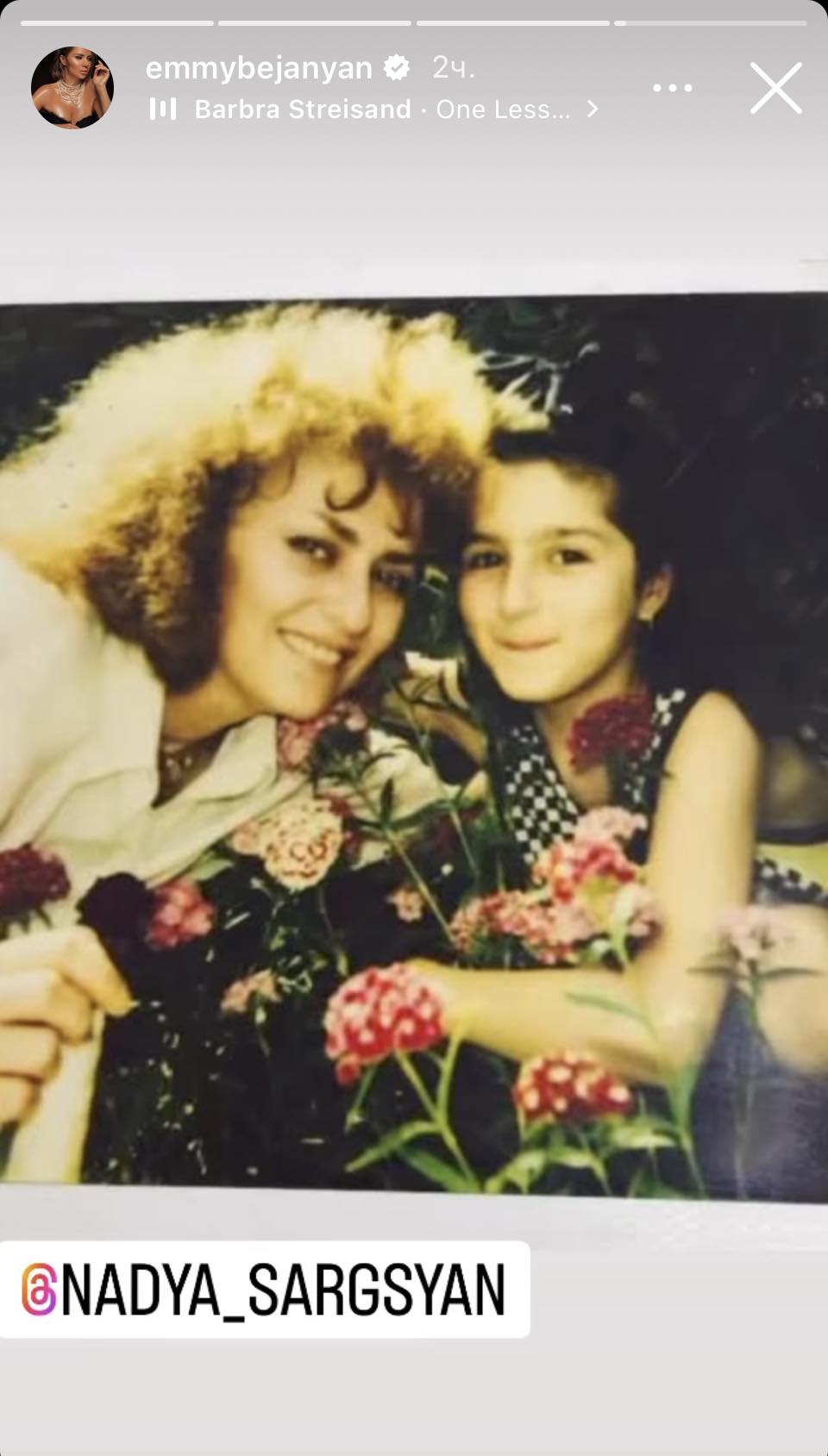 Երգչուհի Էմմին ինստագրամյան իր էջում հրապարակել է արխիվային լուսանկարներ մայրիկի՝ ՀՀ մշակույթի վաստակավոր գործիչ Նադեժդա Սարգսյանի հետ, որոնց կից գրել է. «Սիրում եմ և կարոտում»: