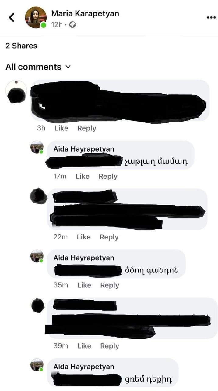 Արցախը ադրբեջանի կազմում ճանաչող քպական մարիա կարապետյանի մոր ՝ աիդա հայրապետյանի ոսկեղենիկ հայերենով պատասխանները սոցցանցերում իր թրքահպատակ աղջկան նախատող օգտատերերին։ Նկարում մարիա կարապետյանն է և իր յանի մայր կոչվող աիդան ու աիդայի կոմենտները։ Ահա ինչ ընտանիքում է մոծացել մարիան ...