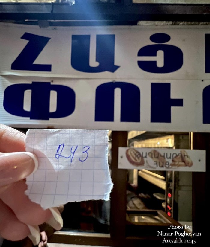 «N 243 Երբ կուշտ փորով հաց ուտեք, կնայեք էս նկարին ու կհիշեք, որ մենք՝ արցախահայությունս, դեռ հացի հերթում ենք... Խիղճդ մեռնի աշխարհ... Խիղճդ մեռնի անտարբեր հայ... Թումանյանը կասեր.