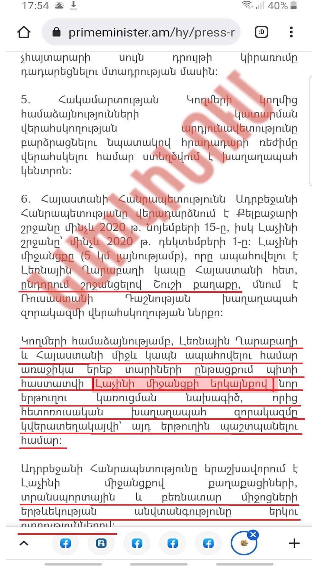 Կողմերի համաձայնությամբ, Լեռնային Ղարաբաղի և Հայաստանի միջև կապն ապահովելու համար առաջիկա երեք տարիների ընթացքում պիտի հաստատվի Լաչինի միջանցքի երկայնքով նոր երթուղու կառուցման նախագիծ…»: