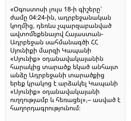 Սա ԱԱԾ-ի պաշտոնական ռելիզից ա։ «Ադրբեջանի տարածքից եկած» ասելով ինչ ինկատի ունեն՞: Նախիջևանից կրակել ա, փամփուշտը հասել ա Կապան՞: Թե ԱԱԾ-ն առանց դեմարկացիա, դելիմիտացիա ու փաստաթուղթ արդեն որոշել ա, որ օդանավակայանին կից մեր օկուպացված տարածքները թշնամունն են՞: