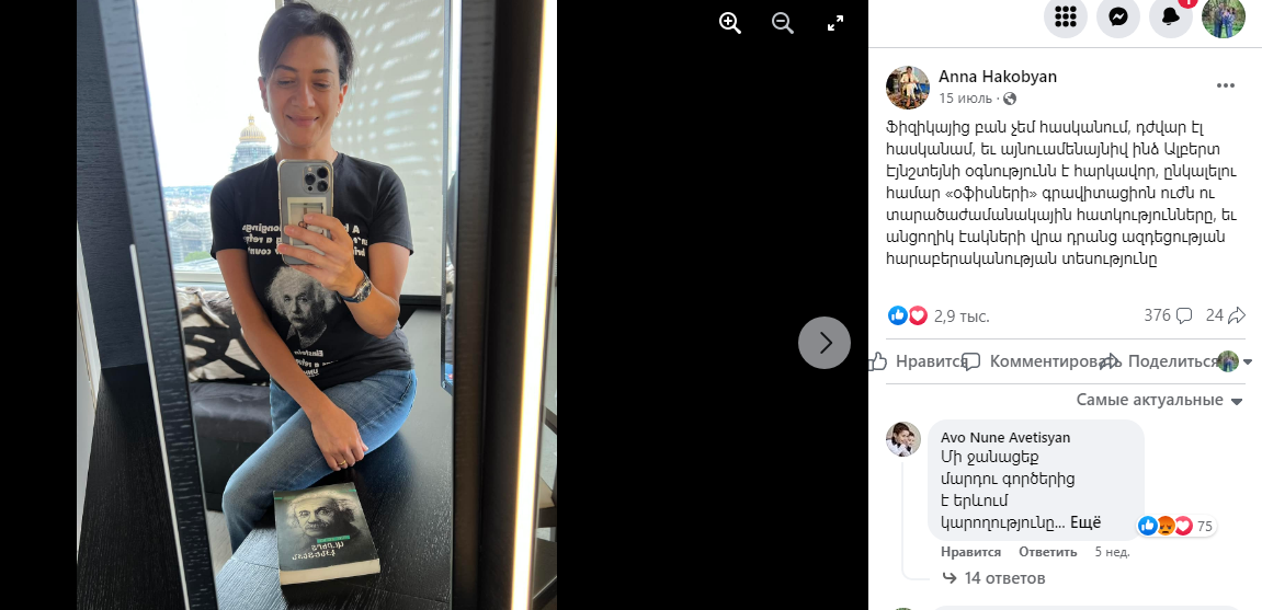 Աննա Հակոբյանը լուսանկարը հրապարակել էր հունիսի 15-ին և գրել. «Ֆիզիկայից բան չեմ հասկանում, դժվար էլ հասկանամ, եւ այնուամենայնիվ ինձ Ալբերտ Էյնշտեյնի օգնությունն է հարկավոր, ընկալելու համար «օֆիսների» գրավիտացիոն ուժն ու տարածաժամանակային հատկությունները, եւ անցողիկ էակների վրա դրանց ազդեցության հարաբերականության տեսությունը»: