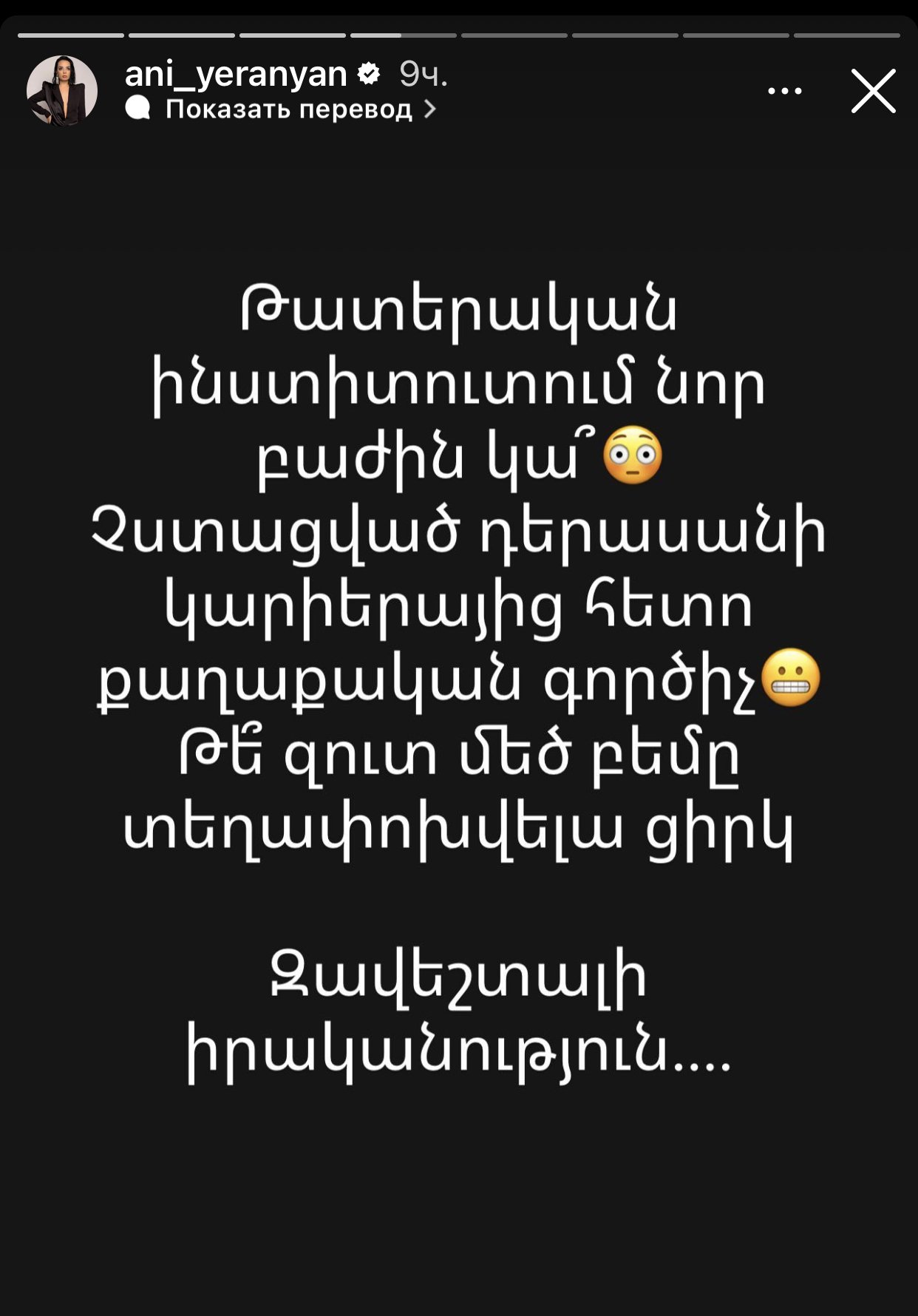 «Թատերական ինստիտուտում նոր բաժին կա՞: Չստացված դերասանի կարիերայից հետո քաղաքական գործիչ: Թե՞ զուտ մեծ բեմը տեղափոխվել է ցիրկ: Զավեշտալի իրականություն»,- գրել է Անի Երանյանը: