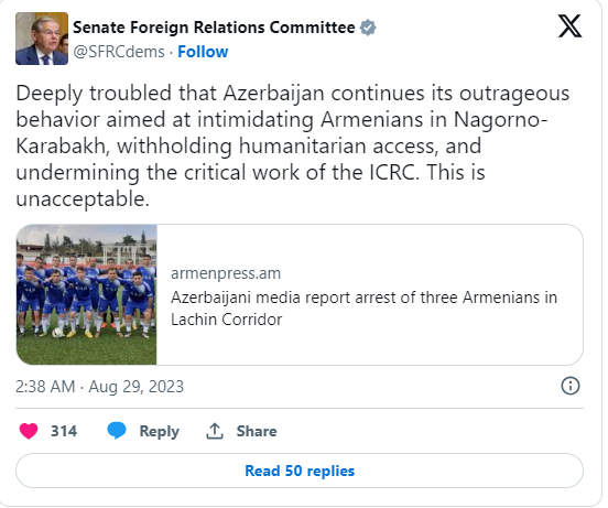 «Խորապես անհանգստացած ենք, որ Ադրբեջանը շարունակում է իր զազրելի պահվածքը, որն ուղղված է Լեռնային Ղարաբաղում հայերին վախեցնելուն, մարդասիրական օգնության մուտքի արգելքին և ԿԽՄԿ-ի կարևորագույն գործունեությունը խաթարելուն: Սա անընդունելի է», - գրված է Սենատի արտաքին հարաբերությունների հարցերով հանձնաժողովի էջում։