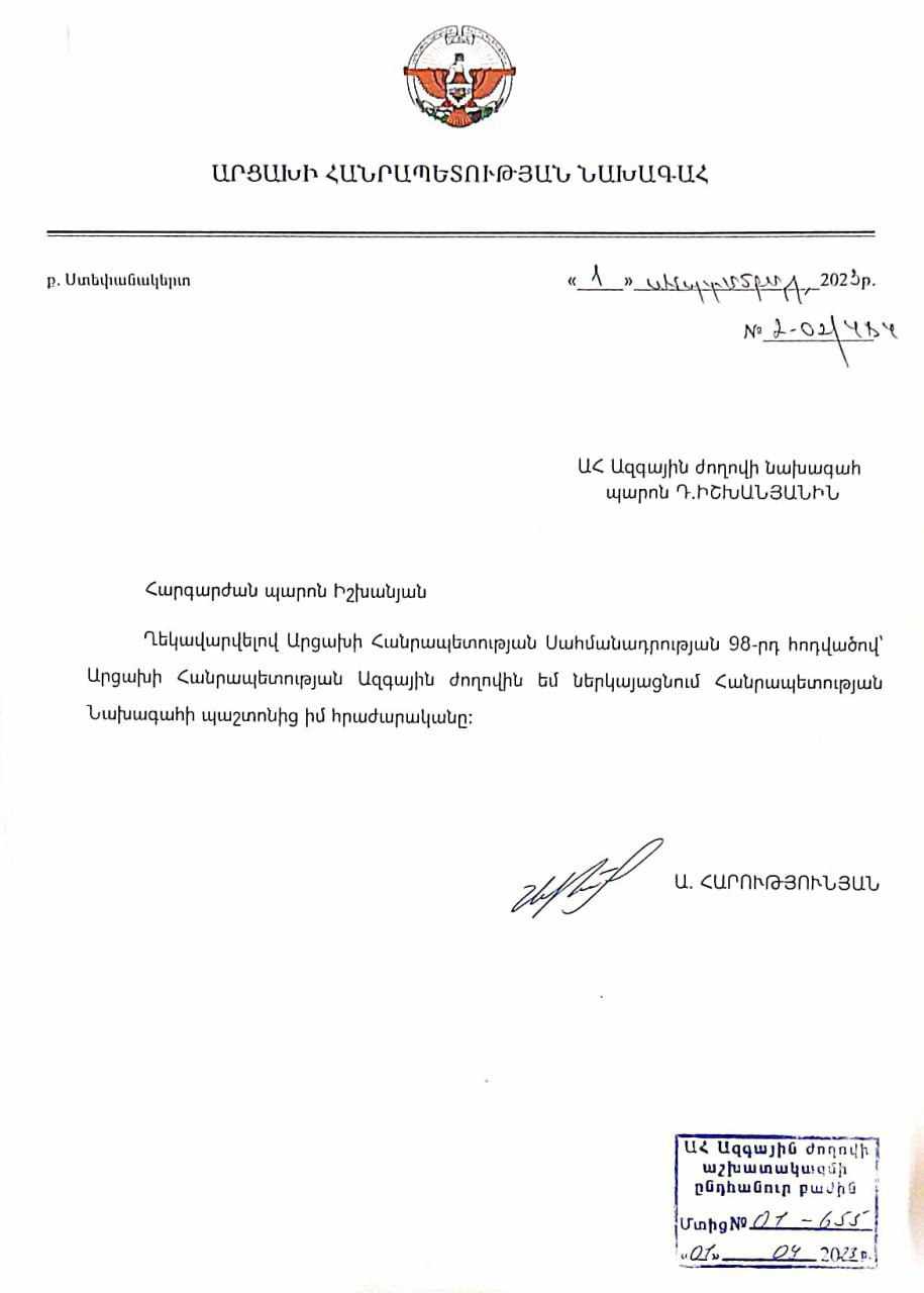 Արցախի Հանրապետության Սահմանադրության 98-րդ հոդվածի համաձայն ՝ Հանրապետության նախագահ Արայիկ Հարությունյանը ս. թ. սեպտեմբերի 1-ին հրաժարականի դիմում է ներկայացրել Ազգային ժողով: