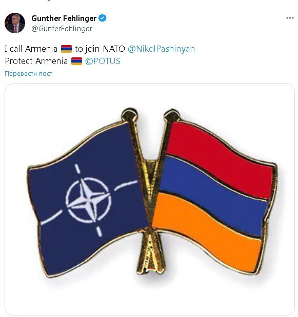 ՆԱՏՕ-ի ընդլայնման հարցերով եվրոպական հանձնաժողովի նախագահ Գյունտեր Ֆելինգերը կոչ է արել Հայաստանին միանալ Հյուսիսատլանտյան դաշինքին: Նա այդ մասին գրել է X միկրոբլոգում: