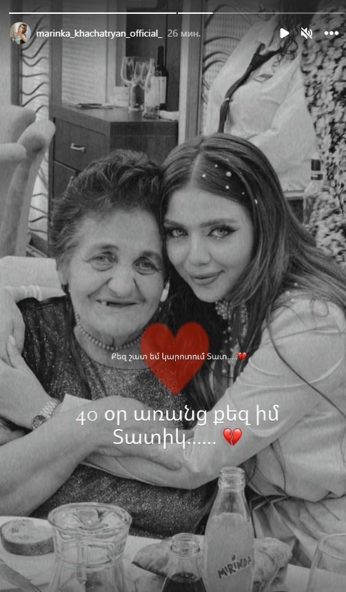 Դերասանուհի Մարինկա Խաչատրյանն շաբաթներ առաջ հայտնել էր, որ կյանքից հեռացել է իր տատիկը՝ հրապարակելով համատեղ լուսանկար, որտեղ պատմել էր իր հույզերի մասին: