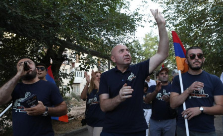 «Մայր Հայաստան» դաշինքի անդամները՝ Անդրանիկ Թևանյանի գլխավորությամբ, Հայաստանի ազգային պոլիտեխնիկական համալսարանի մոտ են։