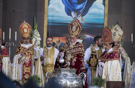 Մյուռոն-ԽԱՉ. Վեհափառը Սրբալույս Մյուռոնը օրհնում է Ս.Խաչով,որում զետեղված է մասունք Տիրոջ խաչափայտից
