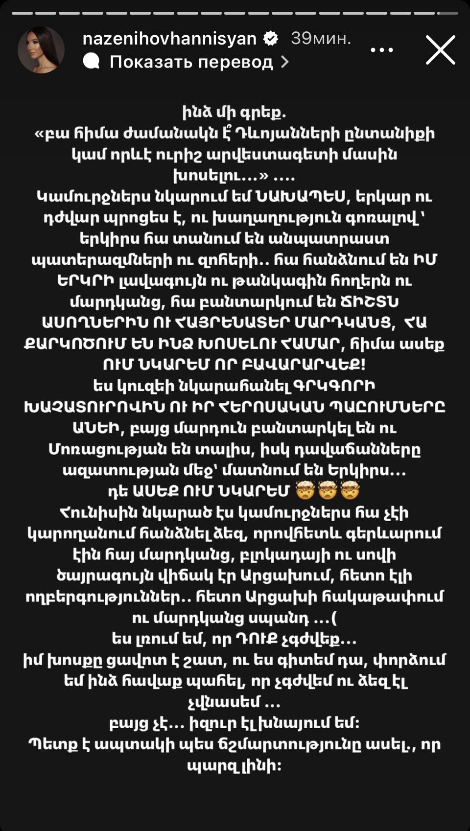 Դերասանուհի, հաղորդավարուհի Նազենի Հովհաննիսյանը երեկ լսարանի դատին է հանձնել «Կամուրջներ» հաղորդաշարի հերթական թողարկումը, որի հյուրերն էին Սոֆի Դևոյանը և Զարուհի Բաբայանը: Մի շարք օգտատերեր նշել են, որ այժմ նման թողարկումների ժամանակը չէ, ինչին ի պատասխան Նազենին գրել է. «Ինձ մի գրեք. «հիմա ժամանակն է՝ Դևոյանների ընտանիքի կամ որևէ ուրիշ արվեստագետի մասին խոսելու: Թողարկումները նկարում ենք նախապես, երկար ու դժվար պրոցես է, ու խաղաղություն գոռալով՝ երկիրս հա տանում են անպատրաստ պատերազմների ու զոհերի... հա հանձնում են իմ երկրի լավագույն ու թանկագին հողերն ու մարդկանց, հա բանտարկում են ճիշտն ասողներին ու հայրենասեր մարդկանց, հա քարկոծում են խոսելու համար, հիմա ասեք՝ ում նկարեմ, որ բավարարվեք: Ես կուզեի նկարահանել Գրիգորի Խաչատուրովին ու իր հերոսական պատումները անեի, բայց մարդուն բանտարկել են մոռացության են տալիս, իսկ դավաճանները ազատության մեջ՝ մատնում են երկիրս: Դե ասեք՝ ում նկարեմ: Հունիսին նկրաս կամուրջներս հա չէի կարողանում հանձնել ձեզ, որովհետև գերևարում էին հայ մարդկանց, բլոկադայի ու սովի ծայրագույն վիճակ էր Արցախում, հետո Արցախի հայաթափում ու մարդկանց սպանդ: Ես լռում եմ, որ դուք չգժվեք: Իմ խոսքը ցավոտ է շատ»: