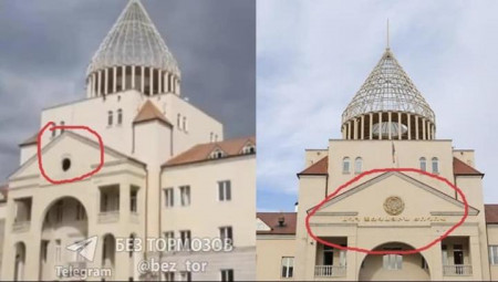 Ադրբեջանցիները Արցախի ԱԺ շենքից պոկել են գերբը, քանդել են նաև «ԱՐՑԱԽԲԱՆԿԻ» հայերեն տառերը։