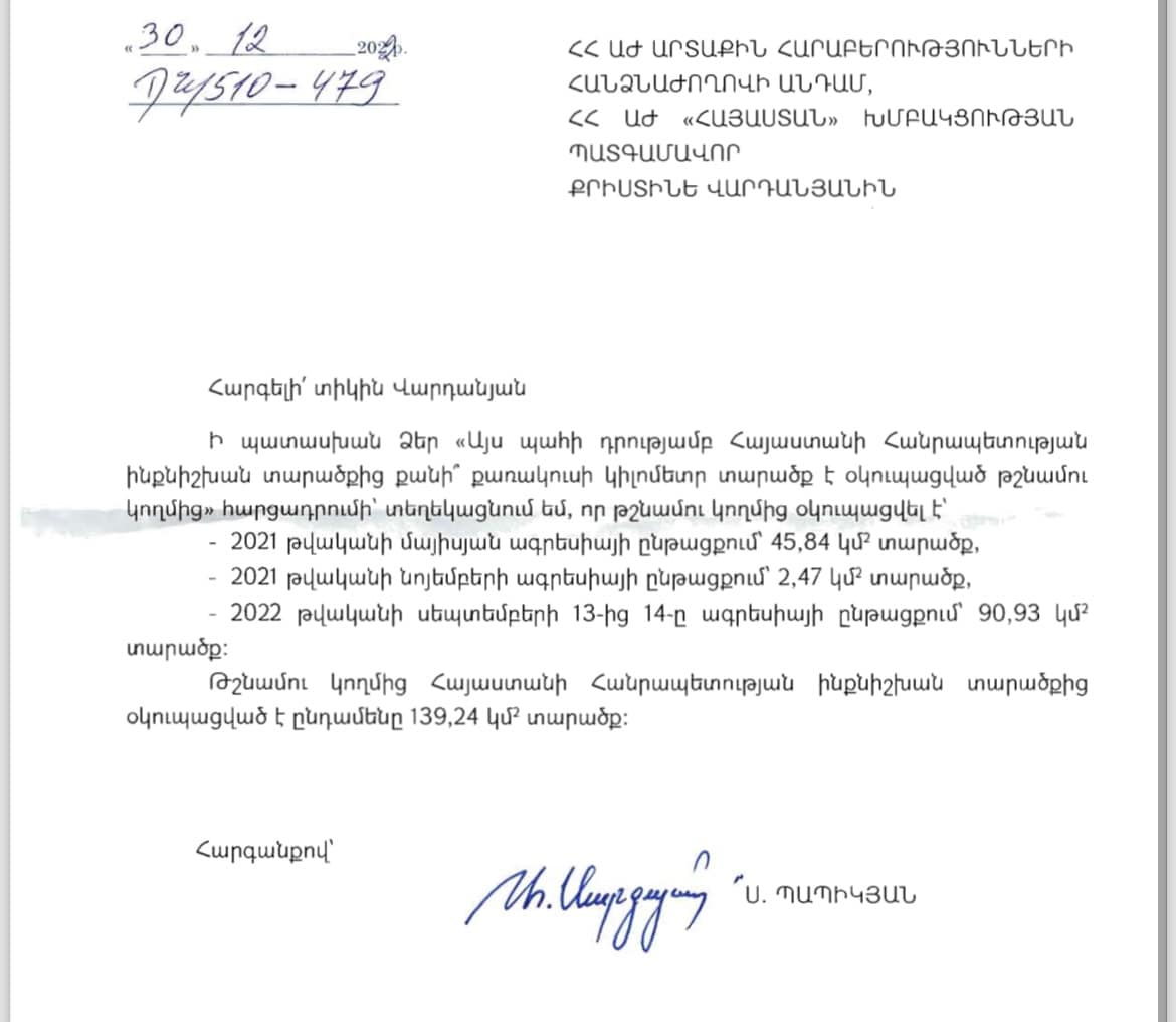 Ստորև տեղադրում եմ այդ հարցման պաշտոնական պատասխանը, որտեղ ասվում է, որ 2022 թ. դեկտեմբերի դրությամբ ՀՀ տարածքից օկուպացված է 139 քառ կմ տարածք: