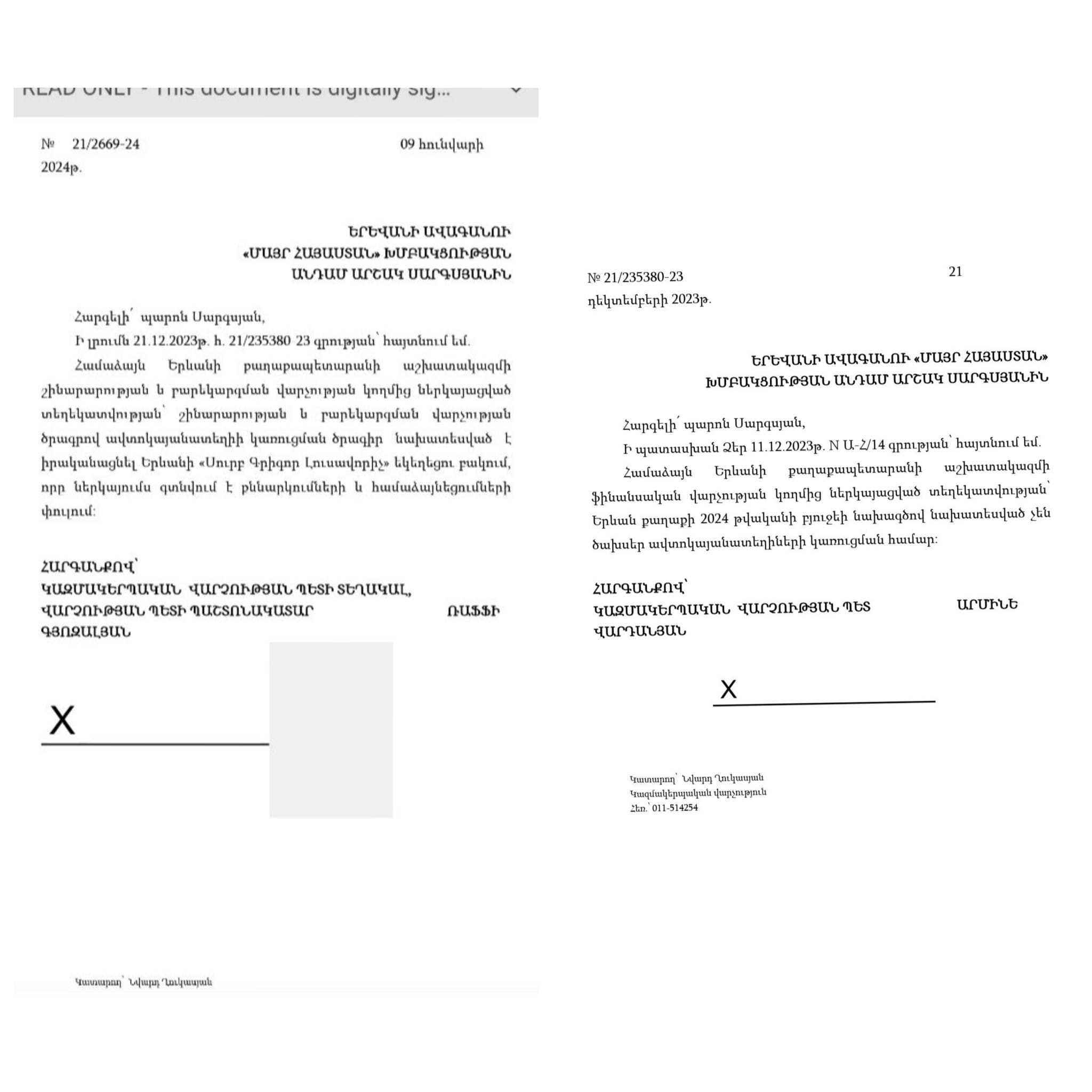 Ի դեպ, իմ հարցը ոչ միայն 2024-ի բյուջեով կառուցելուն էր վերաբերում, այլ ընդհանրապես կայանատեղիներ կառուցելու ծրագիր ունենալ-չունենալուն: Ուշագրավն այն է, որ իմ հարցումներին իրար հակասող պատասխաններ էին տվել քաղաքապետարանի տարբեր վարչությունները: Մի պատասխանում գրել էին, որ ավտոկայանատեղիների կառուցում 2024թ. բյուջեով նախատեսված չէ, իսկ մյուսով գրել էին, որ «Սուրբ Գրիգոր Լուսավորիչ» եկեղեցու բակում նախատեսում են ավտոկայանատեղիների կառուցում (կից լուսանկարում ներկայացված են այդ պատասխանները): Ստացվում է, որ Երևանի քաղաքապետարանի աջ ձեռքը չգիտի, թե ինչ է անում ձախը: