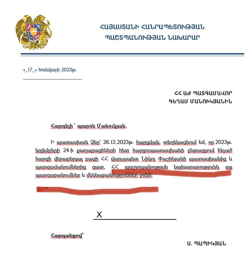 ՊՆ-ի դեպքում համառեցի. կրկին գրավոր հարցում ուղարկեցի՝ հիշեցնելով, որ ՀՀ օրենսդրության համաձայն Պապիկյանը ՊԱՐՏԱՎՈՐ է հարցերիս առանձնաբար պատասխանել, կետ առ կետ։ Էլի նախարարությունը տևական ժամանակ պապանձվել էր, անցնում էին օրերը, իսկ պատասխան չէին կարողանում գտնել։