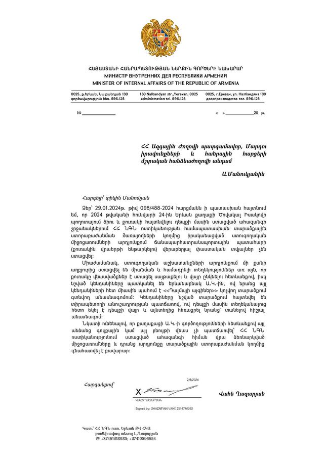 Ստորև ներկայացնում եմ իմ գրությանը ՀՀ Ներքին գործերի նախարար Վահե Ղազարյանից ստացված պատասխանը․