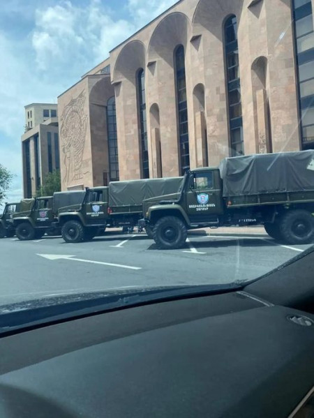 Համացանցում ակտիվորեն տարածվում է այս լուսանկարը, որտեղ պատկերված է ոստիկանության զորքերի ավտոշարասյուն՝ կայանած Երևանի քաղաքապետարանի դիմաց: