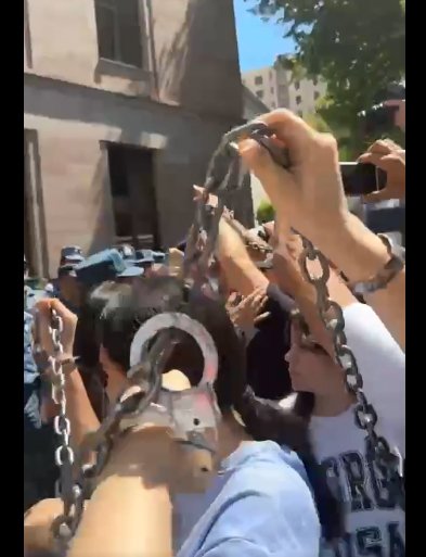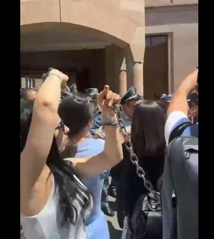 Միաժամանակ, քաղաքացիների մի խումբ էլ ինքնատիպ ու խորհրդանշական եղանակով է արտահայտում բողոքը փաշինյանական ռեժիմի դեմ. նրանք Փաշինյանի ԼՊ-ի մոտ եկել են ձեռնաշղթաներով ու շղթաներով կապված ձեռքերով:
