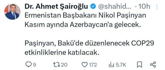 Նիկոլ Փաշինյանը նոյեմբերին կայցելի Ադրբեջան: Այս մասին X-ի միկրոբլոգում գրել է թուրք լրագրող, քաղաքագետ, միջազգային հարաբերությունների փորձագետ Ահմեդ Շայրօղլուն: