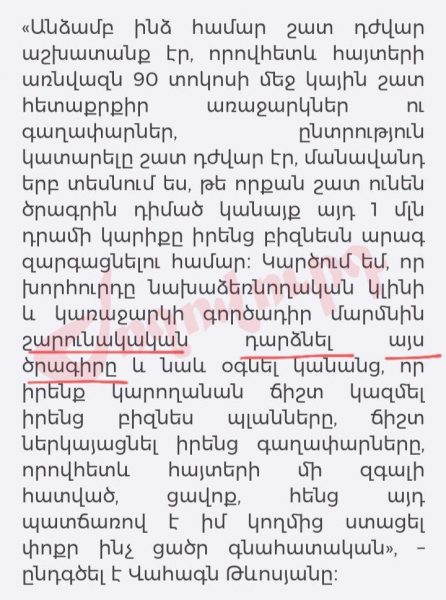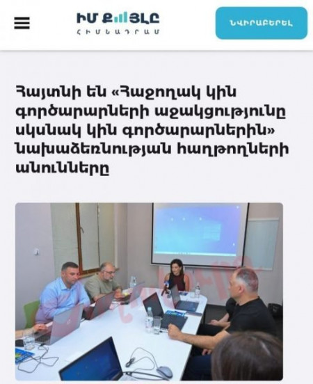 «Ժողովուրդ» օրաթերթը գրում է․ «Վարչապետի տիկնոջ՝ Աննա Հակոբյանի «Իմ քայլը» հիմնադրամը իր պաշտոնական կայքում հաղորդագրություն է տվել նախօրեին դրամահավաքի արդյունքում գոյացած 42 միլիոն դրամը սկսնակ կին գործարարներին բաշխելու մասին։