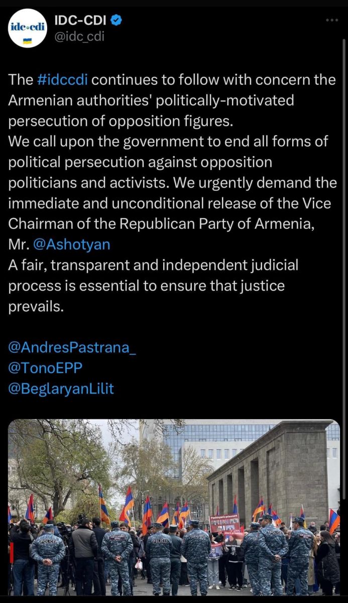 «Կենտրոնամետ դեմոկրատների միջազգային միությունը (CDI) շարունակում է մտահոգությամբ հետևել Հայաստանի իշխանությունների՝ քաղաքական դրդապատճառներով ընդդիմադիր գործիչների նկատմամբ հետապնդումներին: