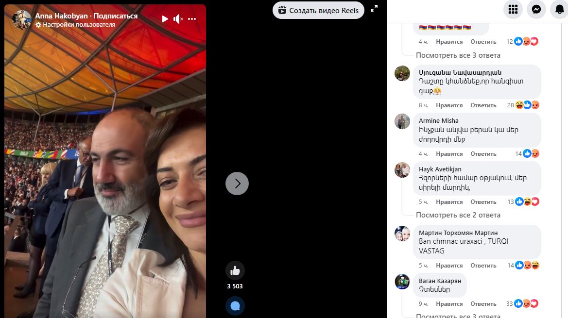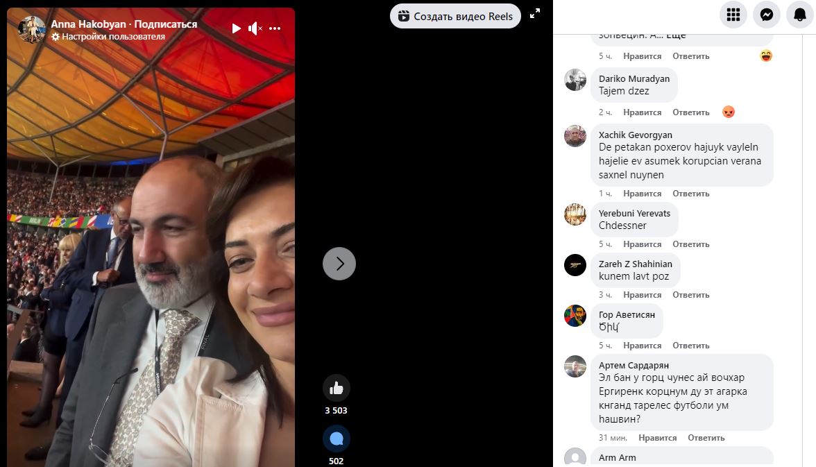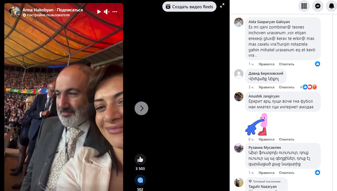 Նիկոլ Փաշինյանի կինը՝ Աննա Հակոբյանն էլ տեսանյութ էր հրապարակել Բեռլինի Օլիմպիաշտադիոնում մարզադաշտից, որտեղ անցկացվեց Եվրո 2024 առաջնության եզրափակիչ Իսպանիա-Անգլիա խաղը։
