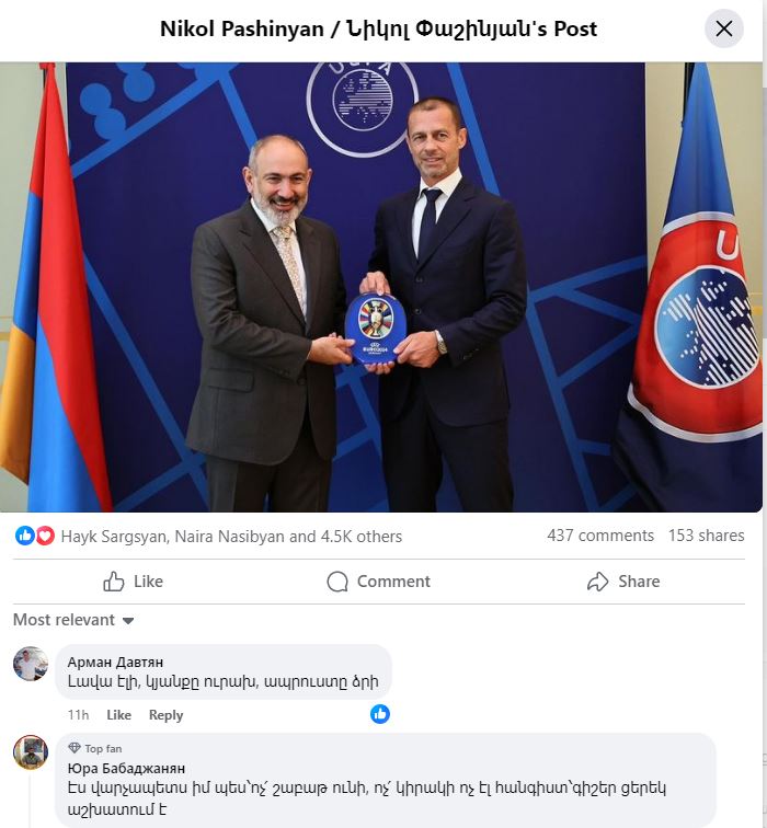 Նիկոլ Փաշինյանը երեկ՝ հուլիսի 14-ին, ֆուտբոլի Եվրոպայի առաջնության եզրափակիչ խաղից առաջ լուսանկար էր հրապարակել՝ գրելով․ «Հանդիպում ունեցա ՈւԵՖԱ-ի նախագահ Ալեքսանդր Չեֆերինի հետ, ում հրավերով ներկա կգտնվենք ֆուտբոլի Եվրոպայի առաջնության Իսպանիա-Անգլիա եզրափակիչ խաղին»։