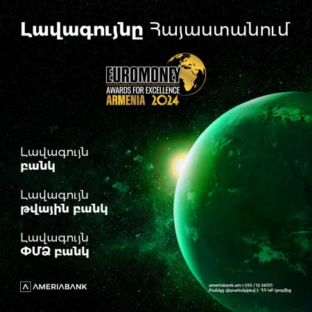 Euromoney միջազգային առաջատար ֆինանսական պարբերականը Լոնդոնում կայացած մրցանակաբաշխության ժամանակ Ամերիաբանկին շնորհել է «Գերազանցության մրցանակ»՝ որպես 2024 թ. լավագույն բանկը Հայաստանում։ 2011թ․ ի վեր Ամերիաբանկը 10-րդ անգամ է արժանանում այս հեղինակավոր մրցանակին։