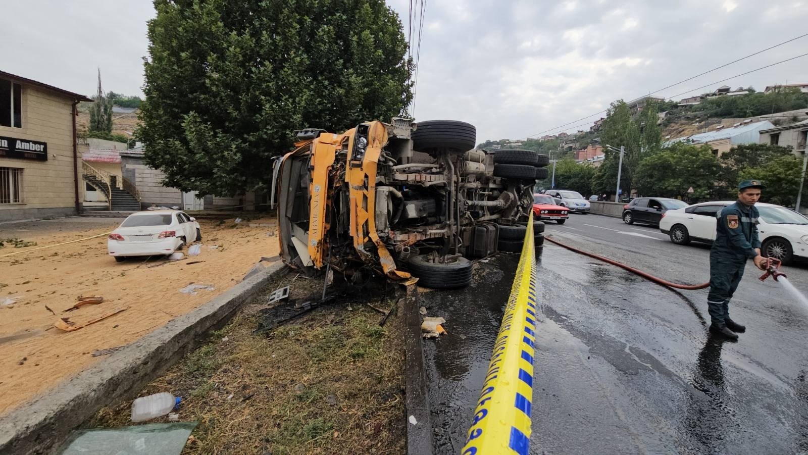 Պարզվել է, որ ցորենով բեռնված բեռնատարը բախվել է թիվ 36 երթուղին սպասարկող «MAN» մակնիշի ավտոբուսին, այնուհետև կայանած «Toyota» մակնիշի ավտոմեքենային և կողաշրջվել։