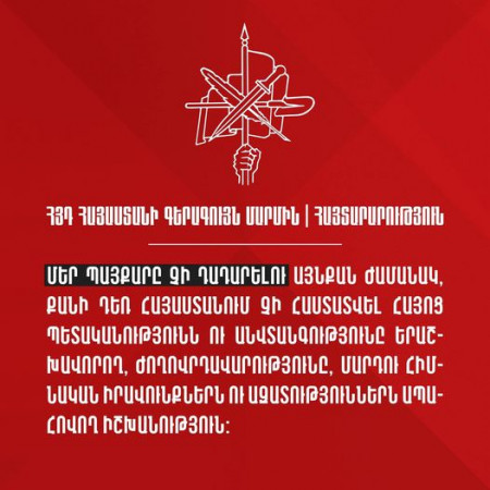 Միաժամանակ ի լուր բոլորի հայտարարում ենք. Մեր պայքարը չի դադարելու այնքան ժամանակ, քանի դեռ Հայաստանում չի հաստատվել հայոց պետականությունն ու անվտանգությունը երաշխավորող, ժողովրդավարությունը, մարդու հիմնական իրավունքներն ու ազատություններն ապահովող իշխանություն»: