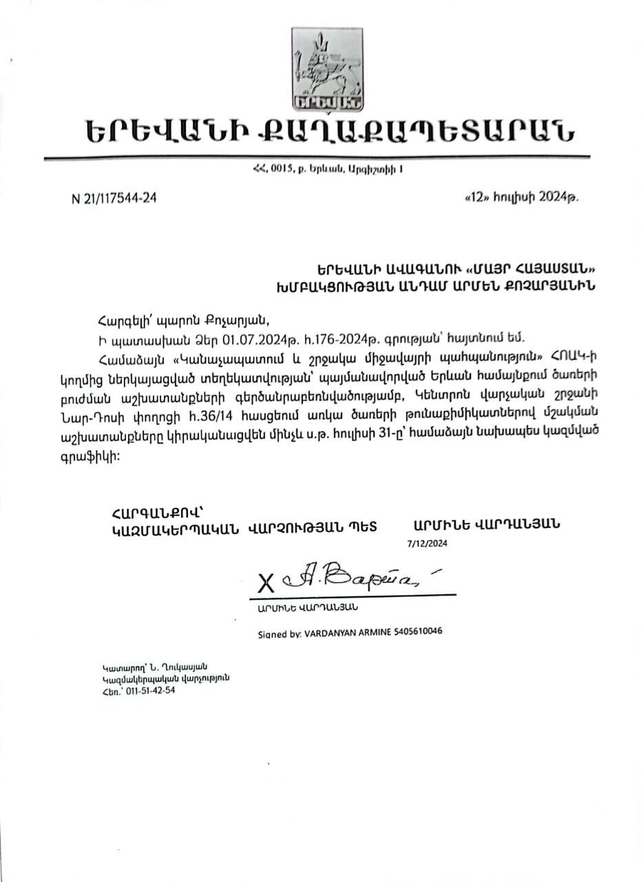 Երևանի ավագանու «Մայր Հայաստան» խմբակցությունը հետևողական է յուրաքանչյուր խնդրի հանդեպ։