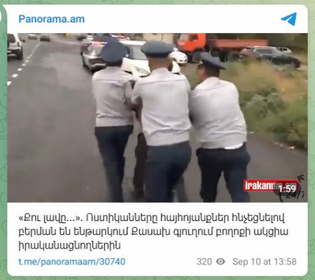 Ոստիկանները նախ ուժով հեռացրեցին ճանապարհը փակած ավտոմեքենաներից մեկը, նաև քաշքշելով բերման ենթարկեցին ճանապարհը փակած քասախցիներին։ Բերման ենթարկելու ընթացքում ոստիկանները հայհոյում են քաղաքացիներին. «Քու լավը...»։