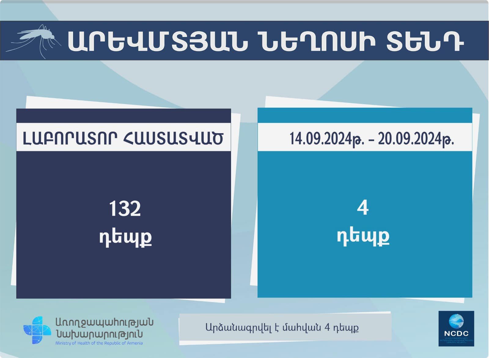 Հայաստանում սեպտեմբերի 20-ի դրությամբ գրանցված է Արևմտյան Նեղոսի տենդի լաբորատոր հաստատված 132 դեպք։ Վերջին մեկ շաբաթում՝ սեպտեբերի 14-20-ը, հաստատվել է հիվանդացության 4 դեպք։ Հայաստանում, ընդհանուր առմամբ, արձանագրվել է Արևմտյան Նեղոսի տենդից մահվան 4 դեպք։ Տվյալները հայտնում են Հիվանդությունների վերահսկման և կանխարգելման ազգային կենտրոնից։