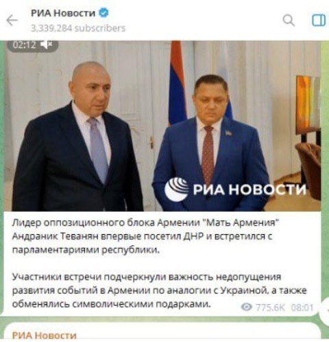 Որպեսզի պատկերացնեք, թե ինչպիսի տեղեկատվական հոսքեր են ապահովվել, բերեմ ընդամենը մեկ օրինակ։ Երբ «Ռիա Նովոստին» իր տելեգրամյան ալիքում տվեց առաջին հանդիպման լուրը Դոնեցկի խորհրդարանում մեր ունեցած հանդիպման մասին, այն կայծակնային արագությամբ հարյուր հազարավոր դիտումներ ունեցավ։ Այս պահին այդ լուրն ունեցել է 775․600 դիտում (տե՛ս կից նկարը)։ Եվ դա ընդամենը մեկ լուրի մասին, իսկ այդպիսիք եղել են հազարավոր։ Պատահական չէ, որ «Յանդեքս» որոնողական համակարգում մեր այցը դարձել էր գլխավոր լուր։