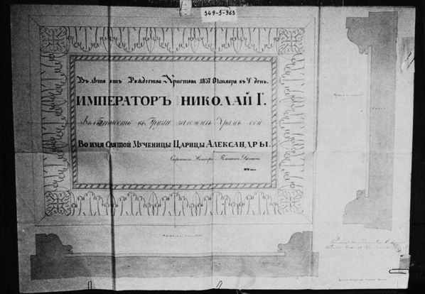 Պահպանվել է նաև Նիկոլայ 1-ին կայսեր հրովարտակը եկեղեցու հիմնարկման մասին, որտեղ գրված է․«Քրիստոսի ծննդից հետո՝ 1837թ․ հոկտեմբերի 4-ի օրը, կայսր Նիկոլայ 1-ինը հիմնեց այս տաճարը Սուրբ նահատակ կայսրուհի Ալեքսանդրայի անունով»։