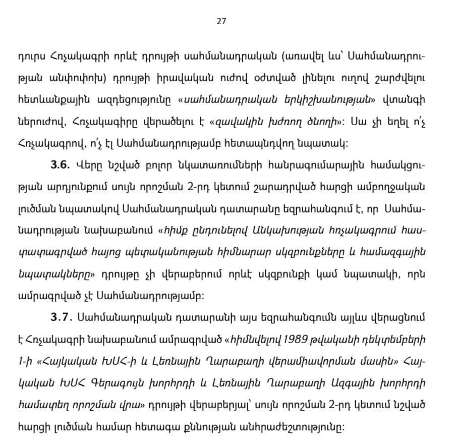 «3.7. Սահմանադրական դատարանի այս եզրահանգումն այլեւս վերացնում է Հռչակագրի նախաբանում ամրագրված «հիմնվելով 1989 թվականի դեկտեմբերի 1-ի «Հայկական ԽՍՀ-ի եւ Լեռնային Ղարաբաղի վերամիավորման մասին» Հայ- կական ԽՍՀ Գերագույն խորհրդի եւ Լեռնային Ղարաբաղի Ազգային խորհրդի համատեղ որոշման վրա» դրույթի վերաբերյալ՝ սույն որոշման 2-րդ կետում նշված հարցի լուծման համար հետագա քննության անհրաժեշտությունը»։