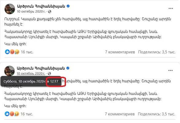«Րոպեներ առաջ հրթիռային հարված են հասցրել Կապան քաղաքին։ Կան զոհեր և վիրավորներ»։ Այս հայտարարությունից միայն 15 րոպե անց՝ ժամը 12։17-ին, Արծրուն Հովհաննիսյանը հանդես եկավ հայտարարությամբ և տեղեկացրեց, որ Կապան քաղաքին հարված չի եղել․