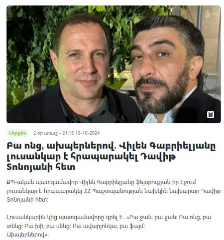 Ուրեմն Տոնոյանի հետ նկար եմ տեղադրել և ինձ համար շատ բնական է, որ կարող են մարդիկ լինել, ովքեր կգան կասեն՝ դատվելու եք կամ բան չմնաց պատի տակ ոտքերիցդ կրակելու ենք, կամ ամբախ-զամբախ վիրավորանքներ գրեն։ Դրան բացարձակապես սառնասիրտ եմ վերաբերվում, ինչքան էլ տարօրինակ կարող են լինել մարդկանց արյունարբու ցանկությունները, ես ըմբռնումով եմ: