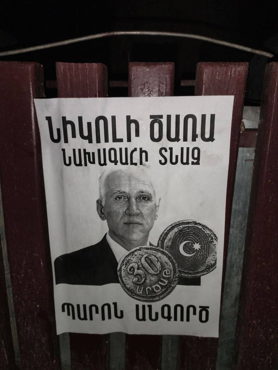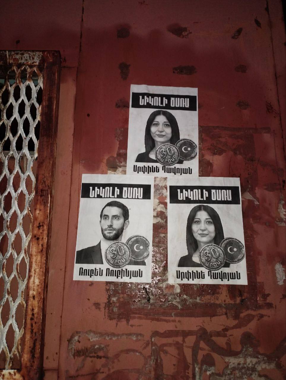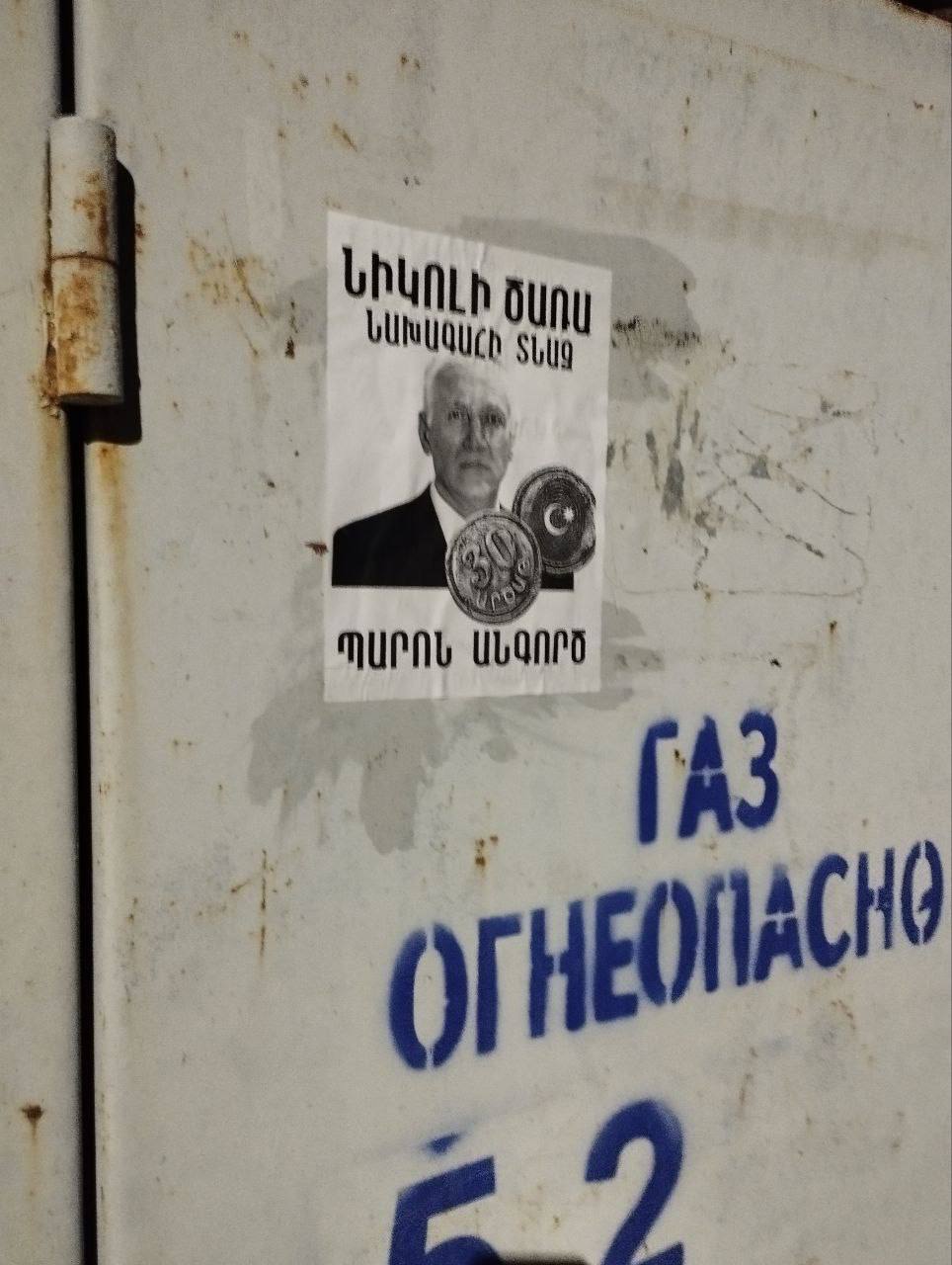 «Նիկոլի ծառա» գրառմամբ նկարներ են փակցվել Երևանի տարբեր փողոցներում։ Հայտնում են «Սրբազան պայքար» տելեգրամյան ալիքում։
