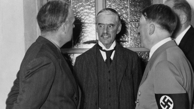 1938 թ. սեպտեմբերի 30-ին Մեծ Բրիտանիայի, Ֆրանսիայի ղեկավարները Ֆաշիստական Գերմանայի առաջնորդ Ադոլֆ Հիտլերի և նույն հայացքները կիսող Իտալիայի ղեկավարի հետ, առանց Չեխոսլովակիայի, ստորագրեցին Չեխոսլովակիան բաժանելու մասին համաձայնագիրը։ Դա արվեց եվրոպայում խաղաղություն ապահովելու անվան տակ։ Ավելին, Չեմբեռլենը և Հիտլերը ստորագրեցին լրացուցիչ անգլո-գերմանական հռչակագիր, որում արտահայտեցին իրենց մտադրությունը «այլևս երբեք միմյանց հետ չպատերազմելու» և վեճերը բացառապես խաղաղ ճանապարհով կարգավորելու վերաբերյալ։ Մեծ Բրիտանիայի վարչապետը հայրենիք վերադառնալուց հետո բառացի հայտարարեց, որ ինքը «բերել է մեր ժամանակաշրջանի խաղաղությունը»։