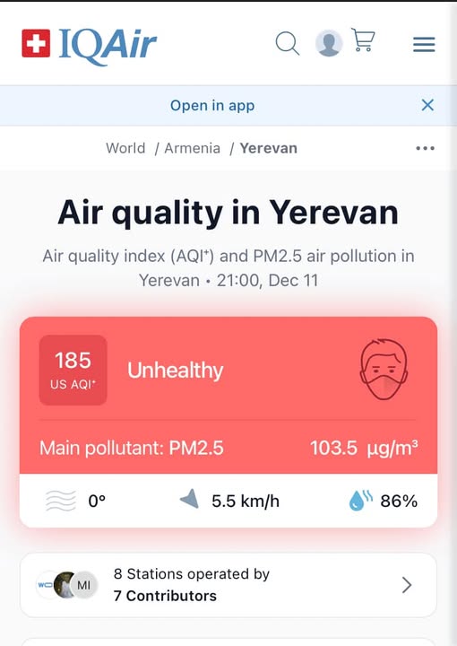 Դերենիկ Մալխասյանը գրում է. «Երևանում, ըստ www.iqair.com կայքի, օդային ավազանի աղտոտվածությունը նշվում է 185 միավոր՝ գնահատվելով որպես ոչ առողջարար։ Այս ցուցանիշով աշխարհում Երևանն ամենաաղտոտված օդն ունեցող քաղաքների շարքում է։ Մայրաքաղաքում օդն այնքան կեղտոտ է, որ խորհուրդ է տրվում դրսում սպորտով չզբաղվել (այդ թվում նաև հեծանիվ չվարել), կրել պաշտպանիչ դիմակներ, պատուհանները փակ պահել և այլն։
