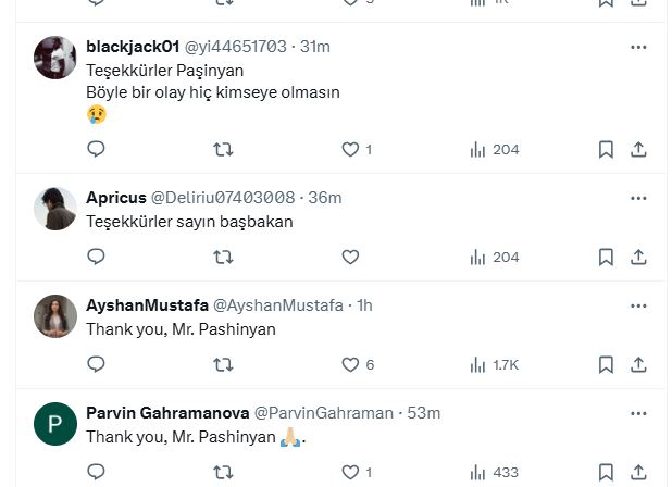 Նիկոլ Փաշինյանը թվիթերյան գրառմամբ ցավակցություն է հայտնել զոհվածների ընտանիքներին, որն արժանացել է ադրբեջանցիների և թուրքերի երախտիքի խոսքերին: