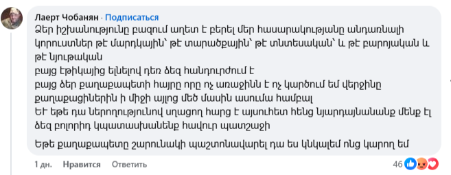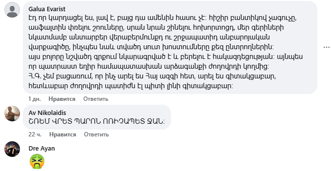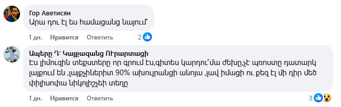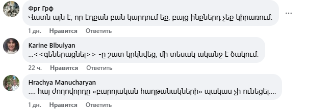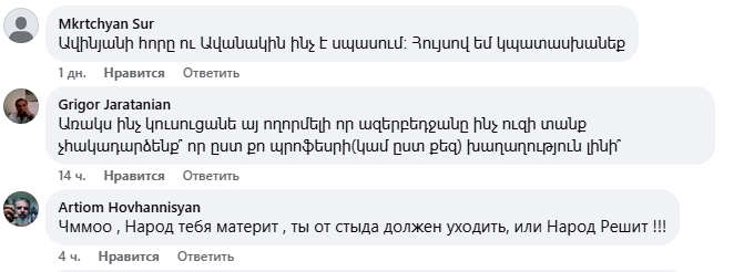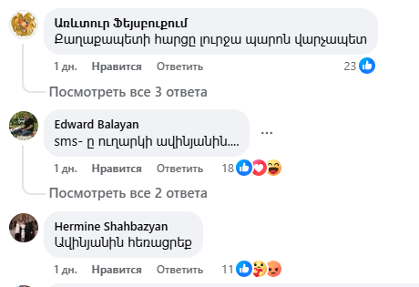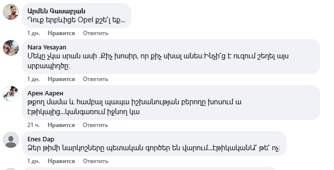 Նիկոլ Փաշինյանի գրառման տակ բազմաթիվ մեկնաբանություններ են, որոնք հիմնականում քննադատություն են, հայհոյանք, վիրավորանք։ Ֆեյսբուքյան օգտատերերը հիշեցնում են Փաշինյանի ու թիմի վատ պահվածքը՝ օրինակներով ու նշում, որ նախ ինքը պետք է էթիկա պահպանի։