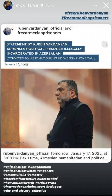 Հայաստանի ֆուտբոլի ազգային թիմի նախկին ավագ և Միլանի «Ինտեր»-ի կիսապաշտպան Հենրիխ Մխիթարյանը ինսթագրամյան էջի սթորի բաժնում կիսվել է Արցախի նախկին պետնախարար Ռուբեն Վարդանյանի հայտարարությամբ՝ օգտագործելով «Ազատություն Ռուբեն Վարդանյանին: Ազատություն հայ գերիներին» հեշթեգերը: