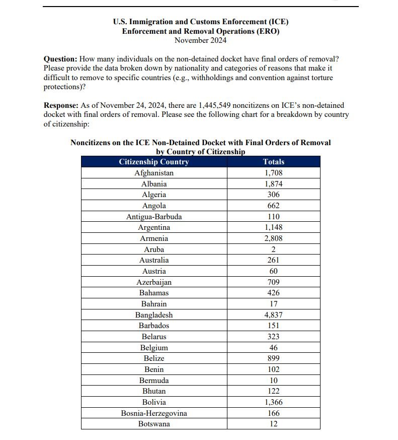 Foxnews-ի հարցմանն ի պատասխան, ԱՄՆ ներգաղթի և մաքսային մարմիններից ԶԼՄ-ին տրամադրել են ցուցակներ, թե որ երկրի քանի քաղաքացի արտաքսման վերջնական հրաման ունի։