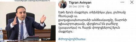 Տիգրան Ավինյանը ջնջել է 2016 թվականին արված իր գրառումը, որում քաղաքապետին խորհուրդ էր տալիս բահով ձյունը մաքրել (ֆոտո)